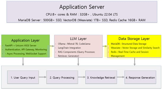 The application layer implements high-performance asynchronous processing through FastAPI and the Uvicorn ASGI server. This layer provides functions such as authentication, API gateway management, and websocket support for real-time communication. The LLM layer integrates the Mistral-7B and CodeLlama models with LangChain to form a RAG pipeline. Here, the query processor analyzes and structures natural language input, the searcher performs context-based information retrieval, and the generator generates responses based on the retrieved knowledge.