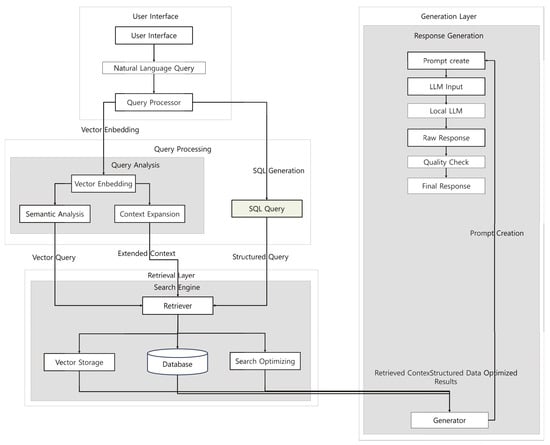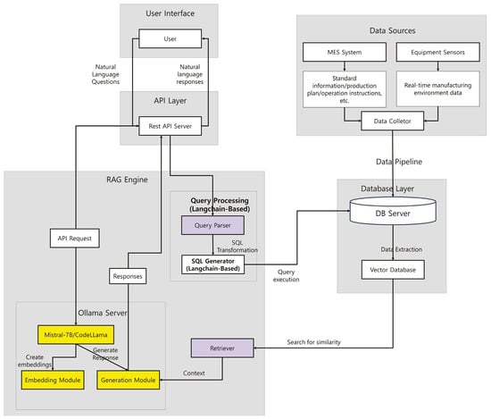 A key element of the proposed architecture is the RAG-based MES data search engine. The engine is designed to provide users with statistical and analytical data to support on-site decision-making by integrating MES data, as well as various data generated by production equipment, in real-time. It consists of three main components: a query processor, a retrieval, and a generator. Each component works complementarily to provide accurate and meaningful responses to user queries.