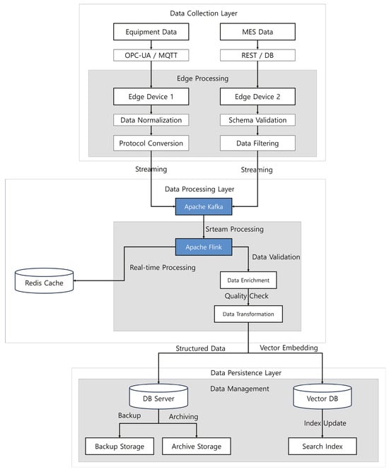 The data-processing architecture proposed in this study was designed as a multilayered structure to achieve both real-time performance and high-quality data []. First, the data collection layer employs edge computing to collect real-time data and apply various protocol conversions and normalization techniques to enhance data quality through initial filtering and pre-processing []. This minimizes data-processing delays, reduces the network load, and supports real-time decision making [].