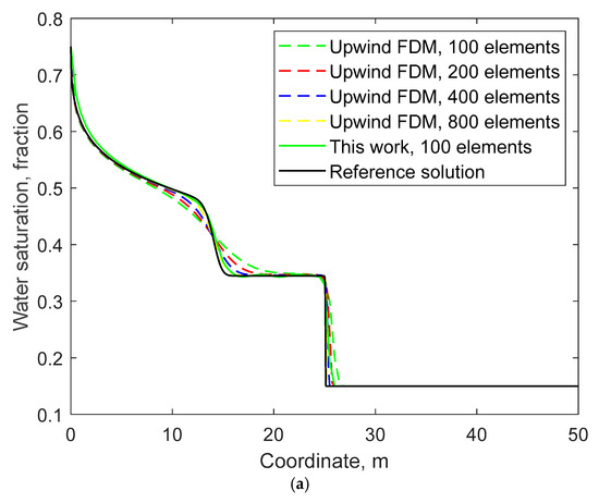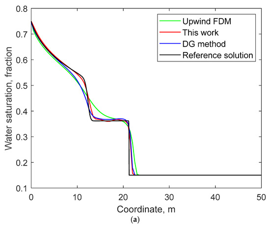 In this section, we will present three numerical examples to evaluate the computational performance of the method proposed in this paper. Specifically, Example 1 is designed to demonstrate that the method in this work has higher computational accuracy compared to the classical upwind FDM and DG methods. Subsequently, we will vary the parameters related to the fluid viscosity to examine the robustness, computational efficiency, and convergence order of our method. Finally, in Example 3, we investigate the impact of viscosity parameters of different types of polymer solutions on the effectiveness of polymer flooding. For the convenience of analyzing the influence of viscosity parameters, in this example, we simply select the polymer–solution viscosity parameters with . However, the corresponding results do not affect the computational robustness of this method under different viscosity-parameter conditions.
