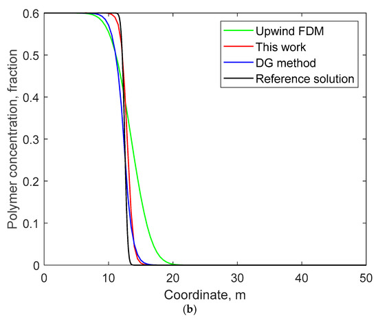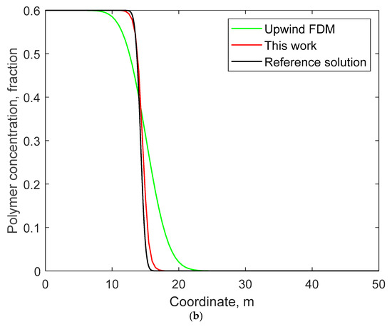 Traditional low-order numerical methods, such as first-order finite difference or finite volume methods, may introduce numerical dispersion, leading to a blurred calculated concentration front [9]. Urrea-Quintero et al. [10] used different numerical methods to solve and analyze various nonlinear models describing diffusion–deformation in hydrogels caused by non-reactive solvent absorption and gave a reasonable prediction of the diffusion–deformation process. Numerical oscillations can cause the instability of the calculation results, especially in high-gradient regions (such as the concentration front) [11]. Therefore, establishing a polymer numerical simulation method that can capture detailed features with high accuracy and good stability is of great significance for accurately describing the polymer-flooding process and improving the efficiency of oilfield development.