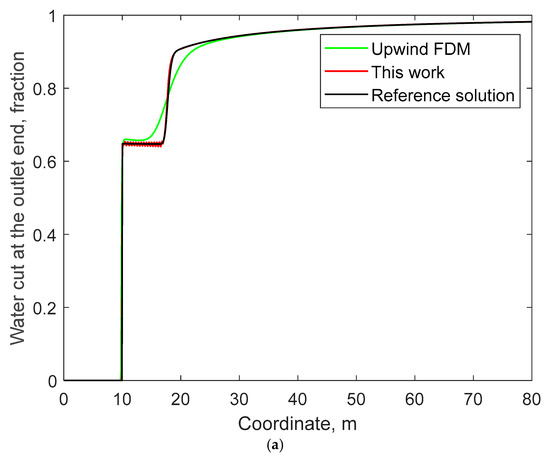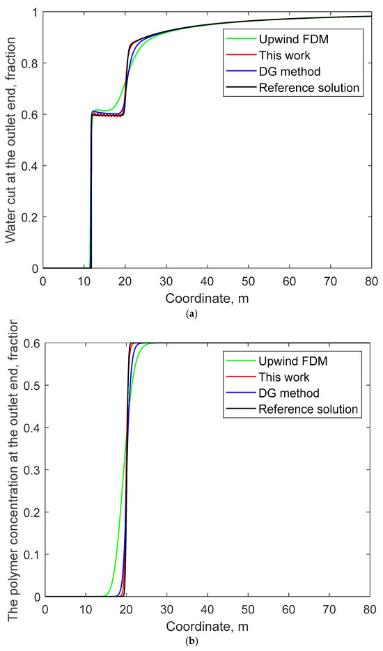 Figure 4 compares the curves of water cut and polymer concentration over time at the outlet end (i.e., at x = 50 m) of the one-dimensional channel within 80 days, which are the water cut and polymer production concentration of production wells that are widely concerned in polymer-flooded reservoirs. It can also be seen from the figure that the calculation accuracy of the method in this paper is much higher than that of the currently commonly used upwind FDM and that of the DG method. Table 2 presents a comparison of the predicted times of water breakthrough and polymer breakthrough at the outlet end by the upwind FDM, the method proposed in this work, and the DG method, along with the reference solutions. Here, we define that when the water-cut rate and polymer concentration at the outlet end exceed 10−4, it indicates the occurrence of water breakthrough and polymer breakthrough at the outlet end. As can be seen from Table 2, although the differences in the predicted water-breakthrough times among the three methods and the reference solution are not overly large, the results obtained by the method in this work are still the most optimal. For the predicted time of polymer breakthrough at the outlet end, the relative error of the prediction by the method in this work is merely 3.3%. The relative error of the prediction by the DG method is 11.59%, which is more than three times that of this work. The relative error of the prediction by the upwind FDM is 29.41%, nearly 10 times that of this work. This clearly shows that the prediction accuracy of the polymer-breakthrough time by the method in this work is significantly higher than that of the upwind FDM and the DG method. Moreover, the polymer-breakthrough time predicted by the upwind FDM, which is commonly used in current simulators, can almost mislead the judgment of on-site engineers. The results of these comparative analyses demonstrate the significance of developing the polymer-flooded reservoir simulation method based on the WENO method in this work.