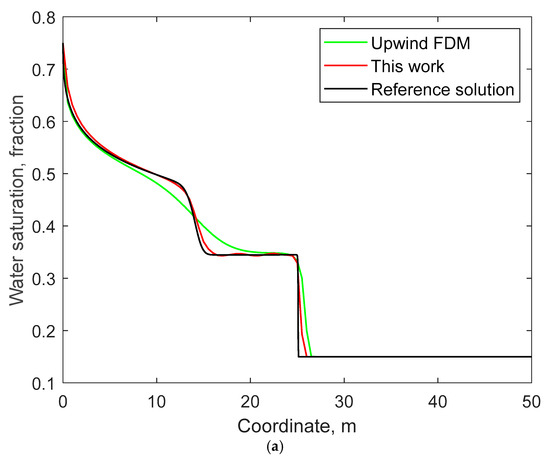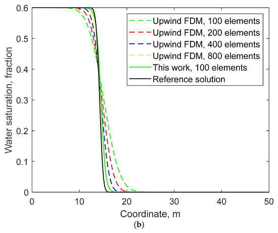 In this example, we modified the power of the relative permeability ratio from 2 to 3, which is the oil–water relative permeability ratio shown in Equation (29). Additionally, we set the initial viscosity of the aqueous phase in Equation (1) to 0.6 cp and . The viscosity of the oil phase was set to 10 cp to test the adaptability of the method in this work to different relative permeabilities and viscosities. The computational domain, other physical property parameters, and the initial and boundary conditions are the same as those in Example 1.