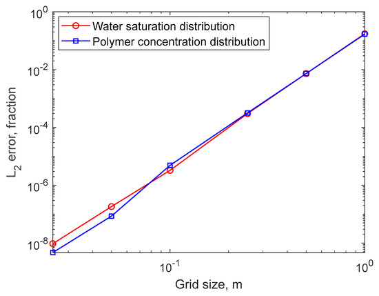 L2 errors versus grid size for water saturation and polymer concentration distributions.