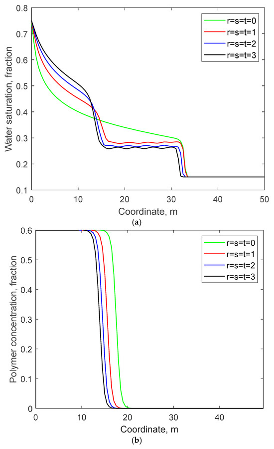 Water saturation and polymer concentration distributions on the 5th day calculated by the method in this work for different values of r, s, and t: (a) water saturation; (b) polymer concentration.