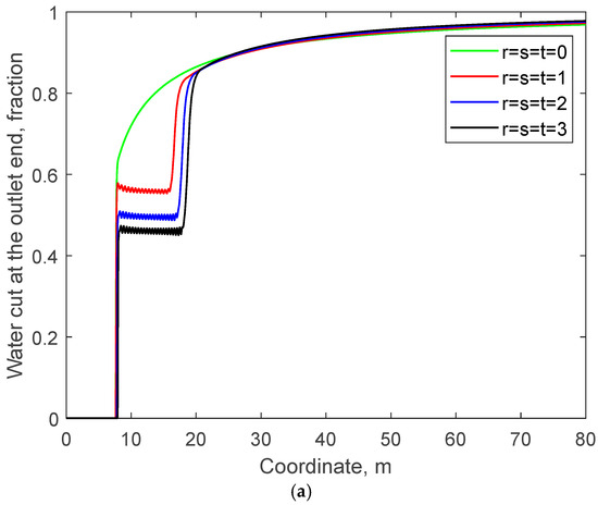 Consequently, it can be observed that when r, s, and t are smaller, the distribution of the injected water in Figure 9a tends to be more towards the right. The polymer in the injected water will also be displaced forward more rapidly along with the overall right-ward distribution of the injected water. In Figure 10, the water cut and polymer production concentration at the outlet end will also rise more rapidly.