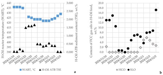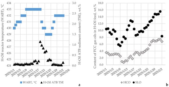 The data in Figure 5a show a sudden increase in sediment level in the H-Oil ATB product from 0.2 to 1.2 wt.% on 18 January 2025. If one compares the data in Figure 5a,b, one can see that regardless of the reduction in the FCC SLO from 10 to 5 wt.% for the period 1 January 2025–9 January 2025 the ATB TSE remained at 0.08 wt.% irrespective of reactor temperature enhancement from 430 to 433 °C. This suggests that the vacuum residue blend composition is favorable from the point of view of retardation of sedimentation. From 14 January 2025 to 17 January 2025, the ATB TSE is stepwise magnified from 0.08 to 0.20 wt.% regardless of the relatively high FCC SLO content in the H-Oil feed of about 10 wt.% suggesting a change in the properties of the vacuum residue H-Oil feed. At 8.6 wt.% FCC SLO in the H-Oil feed and 3.6 wt.% FCC HCO, the content of sediments in the ATB jumped to 1.20 wt.% which is definitely an effect coming from the vacuum residue blend composition. This is associated with a reactor temperature reduction from 433 down to 429 °C. The gradual rise in FCC SLO reaching a peak of 15.6 wt.% and that of FCC HCO of 7.3 wt.% (Figure 5b) is associated with a decline in ATB TSE down to 0.03 wt.% (Figure 5a).