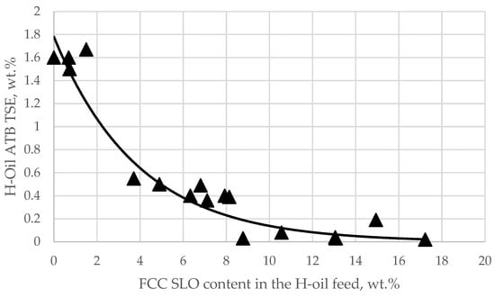 It is evident from the data in Figure 3a,b that the reduction in FCC SLO from about 13 wt.% of H-Oil feed to zero is associated with an increase in the ATB sediment content from 0.1 to 1.6 wt.%. Although the reactor temperature diminished from 436 °C to 424 °C, the ATB sediment content remained at the extremely high level of 1.6 wt.%. Hardly after injection of 7.1 wt.% FCC SLO in the H-Oil feed, the ATB sediment content drops to 0.5 wt.% at a reactor temperature of 422 °C. The augmentation of the FCC SLO amount injected in the H-Oil feed up to 17 wt.% leads to 0.02 wt.% sediment content in the hydrocracked atmospheric residue at 429 °C reactor temperature.