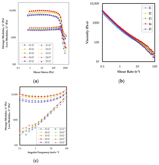 Rheological tests of inks used: (a) amplitude sweeps; (b) flow curves; (c) frequency sweeps.