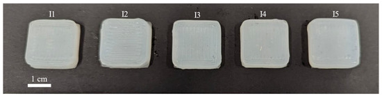 To create stable emulsions, a planetary mixer (Kakuhunter SK300SII from Shashin Kagaku Co., Ltd., Kusatsu, Japan) was utilized in a manner similar to a previous work [47]. Firstly, the polymer blend was speed-mixed and degassed with glycerol at 2000 rpm for 30 s. The high-shear forces induced by the mixer conceived stable emulsions without the aid of any surfactants. Next, nanosilica was added and manually mixed before undergoing an identical speed-mixing and degassing sequence. Five ink formulations with glycerol contents of 10, 20, 30, 40, and 50 parts per hundred rubber (phr) and appropriate nanosilica content for printable structures were studied and listed in Table 1. With respect to the different glycerol concentrations used, the appropriate nanosilica concentration was identified to satisfy the rheological requirements for DIW. The mass of each chemical used for the inks is listed in Table S1. DIW of the samples was carried out via a lead screw-based extrusion printer. Print parameters were kept at a speed of 10 mm∙s−1, via a nozzle of 0.84 mm diameter and a layer height of 0.4 mm. Samples were printed with 100% infill density to ensure porosity was entirely due to leaching of glycerol through solvent extraction. The dimensions of all samples are listed in Table S2.
