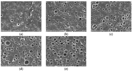 Based on the data shown in Table 3, all foam samples were categorized as macropores [10], as the pore diameters ranged from 2.02 µm to 4.66 µm. For instance, in their work with water as the dispersed phase followed by droplet evaporation to create the foam structure, Kwak et al. [35] reported an average pore diameter of less than 3 µm when 5 wt% water was used, while in the work reported by Turco et al. [11], the pore sizes ranged from 1.768 µm to 65.8 µm with 50 wt% water. Thus, the pores sizes formed in the current study are comparable with other polymeric foams. In addition, the porosities varied from 7.16% to 27.63%, with 20.47% increments when the glycerol content increased from 10 phr to 50 phr. This implied that the silicone foam porosities are tuneable by manipulating the glycerol content alone. In fact, the porosity of the silicone foam was higher than the values declared by Abshirini et al. [20], where their emulsion system consisted of 20 vol% water and various surfactants had porosities between 15% and 25%.