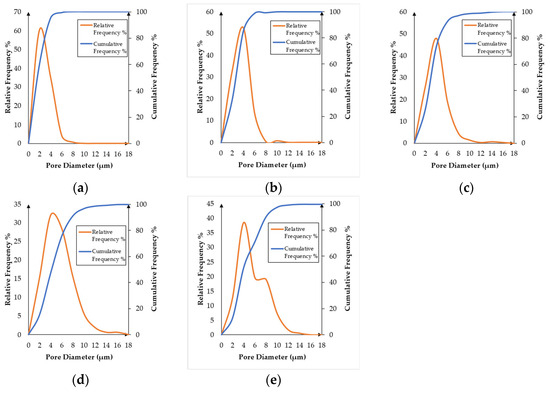 Pore size distributions of foam samples for (a) I1; (b) I2; (c) I3; (d) I4; and (e) I5.