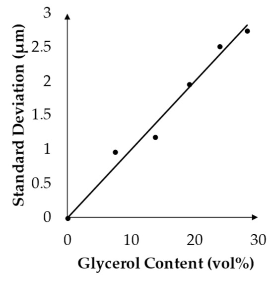 The correlations between glycerol content and each of the abovementioned properties were curve-fitted using Matlab (R2022a) to the linear regression model, and the empirical models generated are listed in Equations (4)–(6) below, showing high goodness of fit, R2. The level of distribution of pore diameter formed (indicated by standard deviation value), average pore diameter, and porosity of the silicone foam are linearly proportional with glycerol concentration in the glycerol/PDMS ink formulations as shown in Figure 5, Figure 6 and Figure 7, respectively. The increment of average pore diameter, standard deviation, and porosity with increased glycerol concentration could be caused by the Ostwald ripening phenomenon. The Ostwald ripening phenomenon explained that the small sol particles are first dissolved and then redeposited onto larger sol particles in liquid sol, such as glycerol droplets in silicone emulsion. The tendency of small sol particles is to redeposit onto larger sol particles to form different pore diameters, despite the average pore diameter increasing with glycerol concentration.
