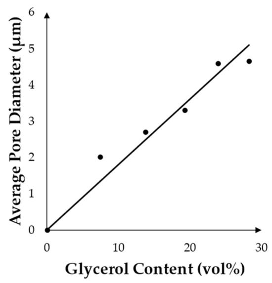 where y2 represents glycerol content (vol%) and x2 is the average pore diameter (µm), with R2 of 0.9481.