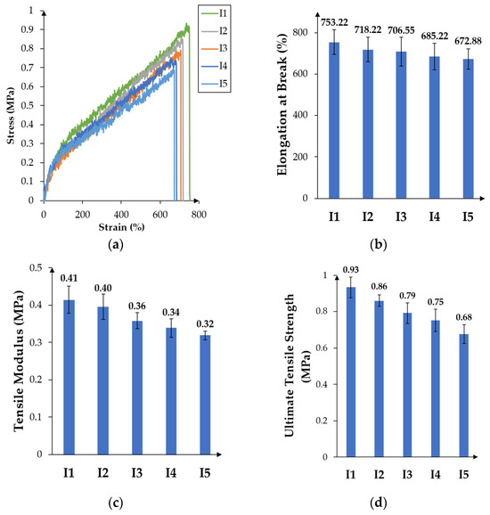 From Figure 8b–d, the elongation at break, tensile modulus, and ultimate tensile strengths of all foams illustrated a downwards trend with the increment in glycerol concentration used in the ink formulation from I1 to I5. With increasing porosity due to the increasing glycerol concentration used, the tensile modulus dropped from 0.41 MPa to 0.32 MPa, while the ultimate tensile strength decreased from 0.93 MPa to 0.68 MPa. Judging by the tensile modulus, the foams in this work were up to 81% less stiff than a similar 3D-printable nonporous silicone ink prepared by Lim et al. [63], which had a modulus of 1.69 MPa. This signifies that introducing porosity to the silicone sample can effectively reduce the stiffness of the printed silicone samples. Moreover, all silicone foams resulting from varied ink formulation (I1 to I5) possessed outstanding ductility, with elongation at break values stretching from 672.88% to 753.22%. The 20.47% increase in porosity from I1 and I5 decreased the elongation at break, tensile modulus, and ultimate tensile strength of the foam samples by 10.67%, 21.95%, and 26.88%, respectively. This denotes that the glycerol content in the glycerol/PDMS ink formulations and subsequent porosity could alter the mechanical properties, especially the ultimate strength of the PDMS foams, the most.