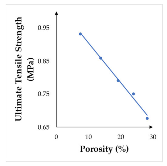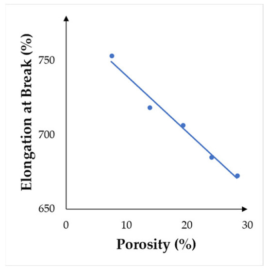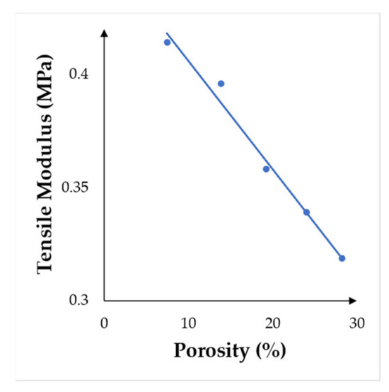 Figure 9, Figure 10 and Figure 11 correlate the relationship between porosity and the tensile modulus, ultimate tensile strength, and elongation at break respectively. The data fitted well to the linear regression models, as indicated by high R2 values of 0.98–0.99. The tensile modulus, ultimate tensile strength, and elongation at break were inversely proportion to the porosity, as indicated in Equations (7)–(9).