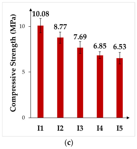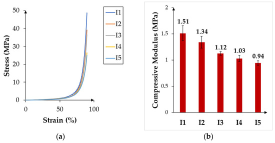 Figure 12a depicts the stress–strain response of foam samples under compression tests. Compression stress–strain curves for silicone rubber generally feature an initial linear region which associates with the foam’s elastic behaviour, followed by a plateau region in which the strain is barely affected by increased stress due to the yielding and energy absorption of cell structures, and lastly the densification region, outlined by the sharp increase of the stress–strain slope due to the immense collapse of cell structures [73,75]. As in the tensile tests performed, foams with different porosity displayed different behaviour under compression testing. It is noticed that the plateau region was elongated in foams with higher porosity, suggesting that more closed cells were subjected to compression with higher energy absorption [44]. Larger pores necessitate a higher strain to achieve compression and filling of voids in the structure [63]. To inspect the compressive performance of all foams, one can contrast the corresponding compressive stress values at a fixed strain [73]. Hence, the compressive stress values at 80% strain of all samples were chosen for the comparison. Figure 12b,c conveys that the compressive modulus and compressive stress of foam samples from I1 to I5 lowered from 1.51 MPa to 0.94 MPa, as well as 10.08 MPa to 6.53 MPa, respectively. As a comparison, the compressive modulus of a commercialized room-temperature vulcanized silicone rubber is disclosed by Kumar et al. [76] as 1.55 MPa. Hence, the compressive modulus of the porous silicone foams synthesized in this study were comparable with commercial silicone rubber despite the compensation of moderate pore structures. The 20.47% greater degree of porosity from I1 to I5 prompted a reduction of 37.75% in compressive modulus, and 35.22% in compressive strength at 80% strain. In brief, the compressive properties of the foam samples were impacted and tuneable solely by the degree of porosity.