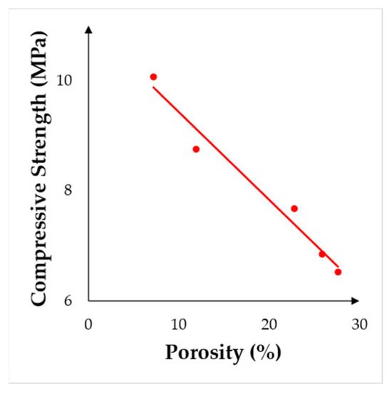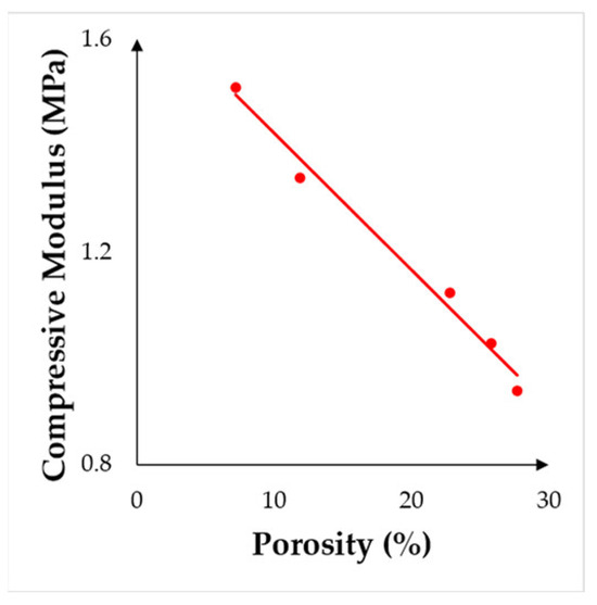 Once again, the strong correlations between porosity and compressive modulus and compressive strength, respectively, as modelled by Equations (10) and (11), proved the inversely linear relationship between porosity and the foams’ compressive properties in this study.