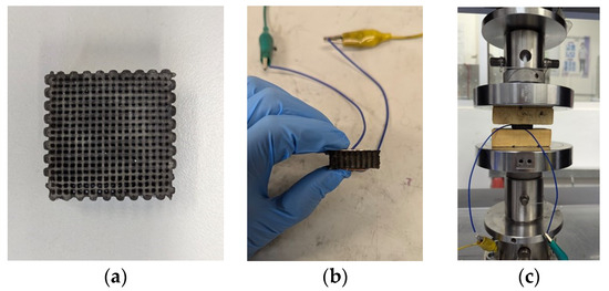 A porous silicone scaffold with a 50% infill was printed based on a 3D CAD model with dimensions of 25 mm × 25 mm × 10 mm. The scaffold was dip-coated in an ethanol/conductive carbon black solution and ultrasonicated. After drying, the strain sensor was fabricated. The resistance values of the silicone foam-based strain sensor were measured with a CD800a digital multimeter from Sanwa Electric Instrument Co., Ltd., Higashiosaka, Japan. The sensitivity of the sensor was measured using the AGS-100 kNX universal testing machine from Shimadzu Corporation, Kyoto, Japan where the sensor sample was subjected to compression strain values of 10%, 30%, 50%, and 70%. The corresponding resistance values were reported to exhibit the relationship between mechanical strain and the resistivity of the sensor.