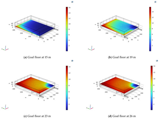 According to the control variable method, the gas migration law is observed for floors with heights of 15 m, 19 m, 23 m, and 26 m in the goaf (Figure 4).
