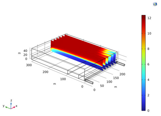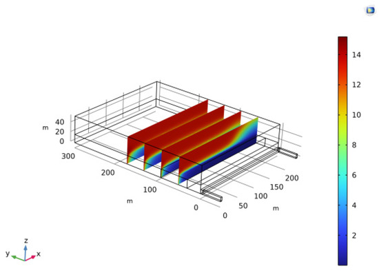 In the absence of additional interventions, the dispersion of gas concentrations via the ventilation system reveals that air currents traverse the main shaft and extend into the work zone. Certain gasses are propelled by the pressure of the airflow and exit through the rear shaft, while other air currents, influenced by negative pressure, transport gasses deeper into the mining cavity. Typically, the mining space adjacent to the work area does not readily experience gas accumulation, as there is an abundance of falling gravel, creating a network of pores and fissures [32].