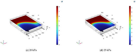 X is between 9.8 m and 31 m, with drilling intervals of 4 m between six holes. Based on these initial conditions, an extraction model is established. When the vertical height is 23 m, a simulation experiment control group with different pressure values is set up using COMSOL, as shown in Figure 7a–d.