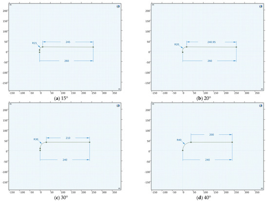 The model was constructed using COMSOL software, with directional long borehole trajectories created at rotation angles of 15°, 20°, 30°, and 40°. The overall length of the borehole trajectory measured 240–260 m. Following two reaming processes, the diameter of the hole reached 115 mm, the extraction negative pressure was set at 20 kPa, and the drilling height was set at 23 m as it was the best extraction layer (Figure 10).