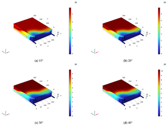 Figure 11a,b are the gas distribution concentration maps for 20 days when the gas extraction trajectory angles are 15° and 20°. Red represents a high gas concentration, and blue represents a low gas concentration.