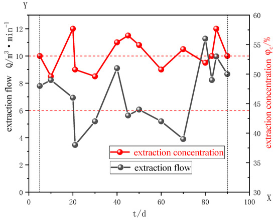 The aforementioned scheme was executed at the 81201 working face, where the gas purity flow and concentration were meticulously monitored within the main pipeline of two drilling fields [36]. The monitoring period spanned 100 days, and a curve illustrating the gas purity flow and concentration was generated based on the optimized data, as depicted in Figure 13.