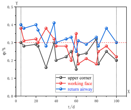 As illustrated in Figure 14, the gas concentration in the upper corner of the optimized working face fluctuated from 0.15% to 0.35%. Similarly, the gas concentration within the working face itself fluctuated between 0.18% and 0.40%, while the return airway experienced variations from 0.28% to 0.42%. Notably, all these concentrations are below those recorded prior to optimization, suggesting favorable extraction efficiency [37].