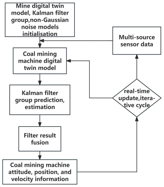 Figure 1 demonstrates the flow chart of the coal mining machine location method, combining the mine digital twin model and the non-Gaussian summation parallel Kalman filter bank. Firstly, the initialized mine digital twin model including coal miner, coal seam, mining equipment, etc., non-Gaussian noise model, and Kalman filter group are established based on the physical entity of the intelligent mine. The coal miner data twin model is improved by combining the collected multi-source sensor data including IMU, odometer, digital twin model, etc.; the filter results are fused after the prediction and estimation steps of the parallel Kalman filter group, outputting the positioning information such as attitude, position, and velocity of the coal mining machine; the output results are fed back to the digital twin model and the multi-source sensor data model; and the estimation results are combined with the model to iteratively loop the positioning process. Due to the advantages of real-time updating and interactive mapping of the digital twin and Kalman filter algorithm, real-time and accurate digital twin model and coal miner position information is finally obtained.