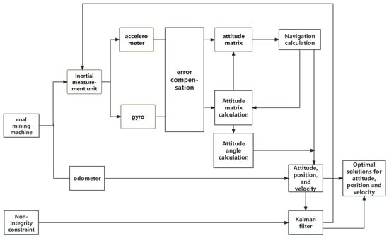This paper takes the coal mining machine Strapdown Inertial Navigation System positioning error compensation technology as the research basis, and its principle is shown in Figure 2. The Strapdown Inertial Navigation System (SINS) is mainly composed of the inertial measurement unit (IMU), navigation computer, navigation display device, etc., of which IMU is mainly composed of a three-axis accelerometer and three-axis gyroscope. Through the measurement of the inertial measurement unit installed on the body of the coal mining machine, the three-dimensional acceleration and three-dimensional angular velocity of the coal mining machine in the inertial space are obtained ; the projection of the angular velocity of the rotation of the reference coordinate system with respect to the geocentric inertial coordinate system in the inertial coordinate system obtained by the navigation computer is updated with ; the attitude matrix is updated ; and the three-dimensional attitude angles of the coal mining machine are obtained by the solver of the attitude matrix: the pitch angle θ, the heading angle γ, the traverse angle ψ; is combined with the attitude matrix and the decomposition of the virtual platform to obtain the acceleration of the coal mining machine in the reference coordinate system ; then the three-dimensional velocity of the coal mining machine is obtained by the integration operation of the navigation calculation, and the three-dimensional position at the current moment is obtained by combining the information of attitude, velocity, and position of the coal mining machine at the previous moment; and finally, the information of attitude, position, and velocity of the coal mining machine is obtained by combining the output results of the instantaneous velocity of the coal mining machine from the odometer mounted on the gear of the coal mining machine with the information on the attitude, position, and velocity of the coal mining machine under the Strapdown Inertial Navigation System. In view of the accumulated error and position drift brought by the Strapdown Inertial Navigation System, the introduction of error compensation can effectively improve the positioning accuracy. Using the dynamic zero velocity correction technology, combined with the non-integrity constraints of zero velocity in the lateral and vertical directions during the movement of the coal mining machine, the attitude, position, velocity and other information is fused by the Kalman filter algorithm, and the result is used as the error feedback to the inertial measurement unit to correct the trajectory in real time, reduce the estimation error, and obtain the optimal estimation value of the coal mining machine’s attitude, position, and velocity, so as to improve the positioning accuracy of the coal mining machine. The accuracy of the coal mining machine localization is improved.