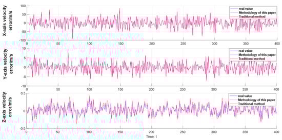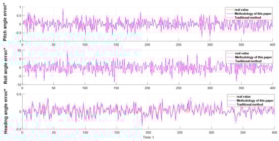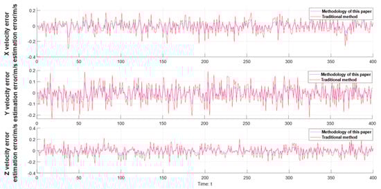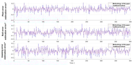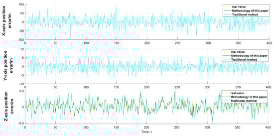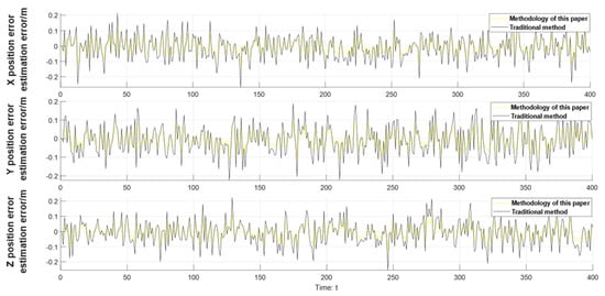 The results of the mechanical arrangement in the coal mining machine positioning Strapdown Inertial Navigation System are estimated by the non-Gaussian summation and parallel Kalman filter group method, and the results of the traditional particle filtering method are compared with the real values of the system in terms of the three-dimensional attitude error of the coal mining machine body , the three-dimensional velocity error of the coal mining machine body , and the three-dimensional position error of the coal mining machine body . The results are shown in Figure 4, Figure 5, and Figure 6, respectively. Figure 4, Figure 5 and Figure 6 show the two filtering methods used to estimate the value of the results minus the corresponding results of the real value. The coal mining machine positioning Strapdown Inertial Navigation System in the mechanical arrangement of the results of this paper’s non-Gaussian summation parallel Kalman filter group filtering method is compared with the traditional non-Gaussian particle filtering method of the coal mining machine body’s three-dimensional attitude estimation error (k + 1 | k + 1), the three-dimensional velocity error estimation for the coal mining machine body (k + 1 | k + 1), the three-dimensional location error estimation for the coal mining machine body, and the three-dimensional position error estimation (k + 1 | k + 1). The comparison results are shown in Figure 7, Figure 8, and Figure 9, respectively. Figure 7, Figure 8 and Figure 9 show the non-Gaussian summation parallel Kalman filter group filtering and non-Gaussian particle filtering, run 400 times to obtain the coal mining machine positioning error estimation. The results take the absolute value and sum divided by the total number of times (400) to obtain the average estimation error results of the different methods of comparison, as shown in Table 2. It can be seen that the non-Gaussian summation parallel Kalman filter group method in this paper has a better performance than the traditional particle filtering method in coal mining machine positioning application. In the three-dimensional attitude error, three-dimensional velocity error, and three-dimensional position error in the nine dimensional parameters of the estimation error, the average estimation errors are greatly reduced. The average estimation errors are reduced by 49%, 52%, 50%, 53%, 51%, 48.8%, 50.1%, 54%, and 51.3%, respectively. It is verified that the method of this paper has a better filtering effect in the coal mining machine positioning system, significantly reduces the average estimation error of the coal mining machine positioning system, and effectively improves the positioning accuracy of the coal mining machine from the dimensions of the attitude, position, and speed of the coal mining machine.