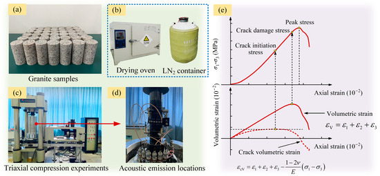 In the experiment, for the sample deformation process, the stress parameters for crack initiation and damage were identified using the stress–strain curve, according to the crack volume strain method [4,5] (Figure 1e). Crack initiation represents the stress level at which cracks begin and is marked according to the reversal points on the curve of crack volumetric strain [4,5]. Crack damage represents the stress level at which unstable crack growth occurs and is marked according to the reversal points on the curve of volumetric strain [4,5].