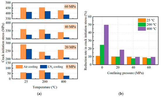 Figure 3 shows the crack initiation stress of heated granite after air and LN2 cooling under various temperatures and confining pressures. For all samples (Figure 3a), high temperatures led to a reduction in the crack initiation stress, especially above 200 °C, and the temperature sensitivity was weakened by the confining pressure. For instance, the crack initiation stress of the LN2-cooled samples decreased by 46.11% when the sample temperature escalated from 25 to 400 °C under unconfined conditions (0 MPa); in contrast, the crack initiation stress decreased by 6.1% from 25 to 400 °C under the confining pressure of up to 60 MPa. The confining pressure caused the cracks to close and made crack initiation more difficult, thus mitigating the temperature-induced differences [20,38]. In addition, the crack initiation stresses of all samples significantly increased with the increase in confinement pressure, suggesting that the presence of confinement pressure makes rock cracking difficult. The crack initiation stress of the LN2-cooled samples at 200 °C increased by 5.97 times when the confinement pressure was increased from 0 to 60 MPa. Moreover, the crack initiation stresses in the LN2-cooled samples were lower than those of their air-cooled counterparts under different confinement pressures, highlighting the efficacy of LN2 treatment in thermally induced mechanical weakening across varying confining pressures. Figure 3b shows the crack initiation stress reduction rate induced by LN2. The reduction rate induced by LN2 was the highest under unconfined conditions. The reduction rate significantly decreased when the pressure exceeded 20 MPa, indicating that the deterioration effect of LN2 on crack initiation stress was weakened by confining pressure due to crack closure caused by the confining pressure. The reduction rate resulting from LN2 was 7.73–18.51% in the range of 20 to 60 MPa, indicating that the LN2 still had a weakening effect on the rock cracking threshold under high confining pressures.