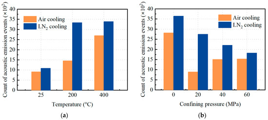 Figure 6 presents the count of AE events of heated granite after air and LN2 cooling under various conditions. Each datum in Figure 6a is the average value of four scenarios (0, 20, 40, and 60 MPa) at the same temperature. Each datum in Figure 6b is the average value of three scenarios (25, 200, and 400 °C) at the same confining pressure.