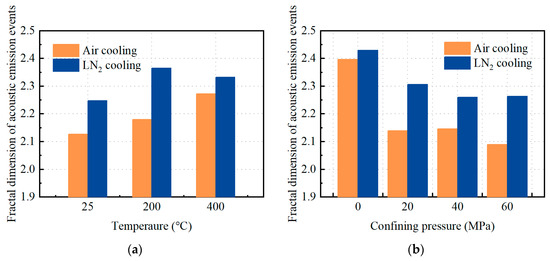 Figure 7 presents the fractal dimension (box counting) of AE events in heated granite after air cooling and LN2 cooling under various conditions. Each datum in Figure 7a is the average of four scenarios (0, 20, 40, and 60 MPa) at the same temperature. Each datum in Figure 7b is the average of three scenarios (25, 200, and 400 °C) at the same confining pressure. The fractal dimension of all samples tended to increase with the sample temperature (Figure 7a) and decrease with confining pressure (Figure 7b). The fractal dimension of the LN2-cooled samples exceeded that of their air-cooled counterparts across varying temperature and confining pressure regimes, indicating that the cryogenic LN2 enhanced crack complexity under diverse conditions. The higher fractal dimension indicates a more intricate crack network, resulting from the LN2-induced thermal damage. This increased crack complexity under LN2 cooling suggested that the cryogenic effect not only influenced the initiation of cracks but also their distribution.