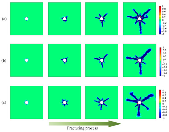 Damage distribution during fracturing processes with (a) water, (b) nitrogen, and (c) liquid nitrogen.
