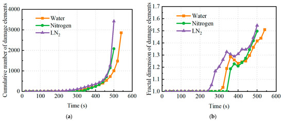 Figure 9 presents the cumulative number of damage elements and the fractal dimension (box counting) of the damage distribution during water, nitrogen, and LN2 fracturing. The number and fractal dimension of damage due to LN2 fracturing were higher than those of the other two methods, indicating that LN2 fracturing promoted fracture complexity. The temperature difference between the reservoir and LN2 led to significant thermal stresses, combined with the injection pressure, resulting in the formation of a greater number of more complex fractures. There was zero damage at a lower injection pressure. The number of damages increased with the increase in the injection pressure, and the corresponding injection pressure was determined as the initiation pressure [40]. The number and fractal dimension of damages rapidly increased as the injection pressure further increased, indicating that unstable damage occurred. The corresponding injection pressure was determined as the instability pressure [40].