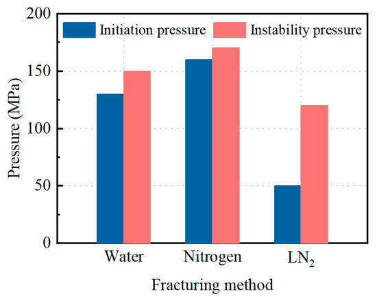 Figure 10 presents the initiation pressure and instability pressure of the water, nitrogen, and liquid nitrogen fracturing models. The initiation and instability pressures of nitrogen fracturing exhibited high values, indicating that a higher breakdown pressure was needed for deep geothermal reservoirs with a high temperature and in-situ stress via mere injection pressure. This also reflected the fracturing difficulty regarding deep geothermal reservoirs. The initiation and instability pressures of water fracturing were lower than those of nitrogen fracturing because thermal stresses were generated to reduce breakdown pressures. However, the breakdown pressures of water fracturing still displayed high values under the effect of thermal stress, which was one of the limiting factors for hydraulic stimulation in deep geothermal reservoirs. Compared with water and nitrogen fracturing, the initiation pressures of LN2 fracturing decreased by 61.54% and 68.75%, and the instability pressures of LN2 fracturing decreased by 20% and 29.41%, respectively. These results suggest that LN2 fracturing offers advantages by reducing the breakdown pressures for the geothermal reservoirs under high temperatures and high in-situ stress conditions.