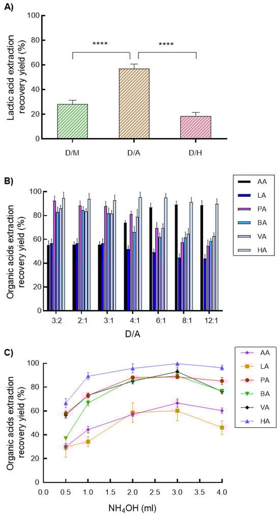 Recovery yields of lactic acid (LA) extraction in a blank culture medium by a 2:1 (v:v) ratio of dichloromethane/methanol (D/M) partition, dichloromethane/acetonitrile (D/A), and dichloromethane/hexane (D/H) as extraction solvent, respectively, were compared with 2 mL of 3.5 mol/L NH4OH for further extraction (Figure 1A). The highest recovery yield of LA was 57 ± 4% by the D/A partition, while it was 28 ± 3% by D/M (p < 0.0001) and 19 ± 3% by D/H (p < 0.0001).