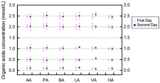 Stability of six organic acids at different theoretical concentrations in NH4OH solution, tested on the first day and the second day. n = 3, Mean ± SD. AA, acetic acid; PA, propionic acid; BA, butyric acid; LA, lactic acid; VA, valeric acid; HA, hexanoic acid.