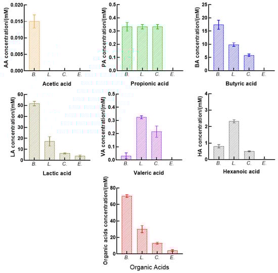 Probiotics and pathogenic bacteria play a role in inflammation, metabolites of intestinal flora, kidney function, and quality of life []. In our study, two representative probiotics, Bifidobacteria longum and Lactobacillus acidophilus, and two pathogenic bacteria, Campylobacter jejuni and Escherichia coli, were selected for the verification experiment on fatty acid extraction efficiency. The results are shown in Figure 3. The concentration of acetic acid was (0.015 ± 0.002) mM in B. longum fermentation, while the other three strains hardly fermented to produce AA. Except for E. coli, the propionic acid could be produced in B. longum, L. acidophilus, and C. jejuni fermentation at nearly the same concentration of 0.33 mM. The butyric acid contents produced by B. longum, L. acidophilus, C. jejuni, and E. coli fermentation decreased sequentially, as well as lactic acid levels. The concentrations of BA and LA were the highest, reaching (17.42 ± 1.69) and (51.68 ± 2.02) mM in Bifidobacteria longum fermentation, respectively. L. acidophilus, also a predominant mutualist of the human microbiota, produced the highest content of valeric acid and hexanoic acid, measuring (0.32 ± 0.01) and (2.32 ± 0.10) mM, respectively. The concentrations of the six tested organic acids were (70.29 ± 1.60), (30.17 ± 4.30), (13.09 ± 1.10), and (4.06 ± 1.00) mM by B. longum, L. acidophilus, C. jejuni, and E. coli, respectively.