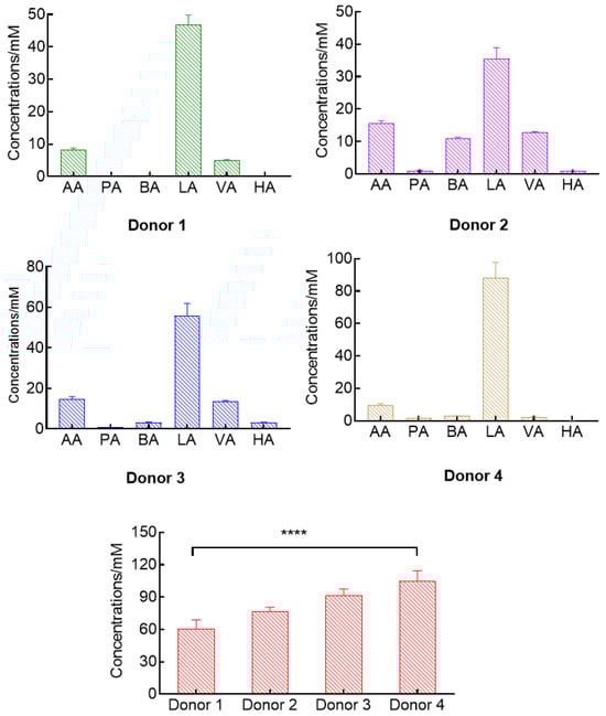 There is a high distinctness in concentrations of organic acids from the mammalian gut microbiota anaerobic fermentation. The levels of short-chain fatty acids in feces are closely related to personal dietary habits []. In our study, we also tested the differences in natural organic acids among individual feces using this method. The results of organic acid production from individuals of different genders and ages with varying eating habits are shown in Figure 4. For four donors, they had obviously different AA, PA, BA, LA, VA, and HA concentrations, which were (8.21–15.67), (0.23–1.50), (0.35–3.26), (35.51–88.31), (2.04–13.66), and (0.11–3.23) mM, respectively. Total organic acid contents ranged from (60.92 ± 8.00) to (104.87 ± 9.63) mM, showing remarkable variation among individuals. This extraction method and LC-MS analytical technique can be successfully used to determine individual differences in organic acids in vitro and in vivo and to further analyze their biological correlates.