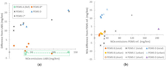 Measurements of NOx with PEMS: (a) Laboratory: differences of PEMS from laboratory equipment LABS (Equation (1a,b)). The asterisk indicates tests with vehicle V1. (b) On-road: differences of PEMS from reference PEMS A (Equation (2)).