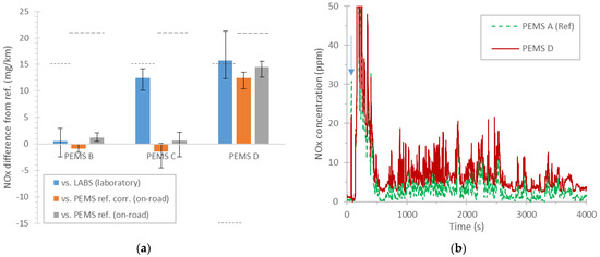 PEMS assessment. (a) The assessment of PEMS in the laboratory and on the road. First blue bars are laboratory validation results (Equation (1a,b)). Second orange bars are the on-road differences corrected with the reference PEMS validation results (Equation (4b)); third columns are the on-road PEMS differences (Equation (2)). Error bars give min-max values. Dotted lines give the permissible tolerance defined in the regulation, applicable only for the validation tests (i.e., PEMS vs. LABS, blue columns), while dashed lines give the extended tolerances applicable only to PEMS comparisons (orange and grey columns). (b) NOx real time concentrations during the first 4000 s of an on-road trip. The arrow indicates ignition of the engine. High concentrations have been cut out to focus on the low concentrations.