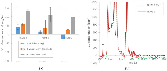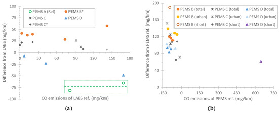 Measurements of CO with PEMS: (a) Laboratory: differences of PEMS from laboratory equipment LABS (Equation (1)). The asterisk indicates tests with vehicle V1. (b) On-road: differences of PEMS from reference PEMS A (Equation (2)).