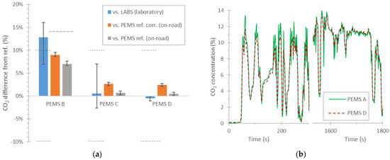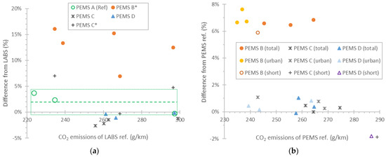 Measurements of CO2 with PEMS: (a) Laboratory: differences of PEMS from laboratory equipment LABS (Equation (A1)). The asterisk indicates tests with vehicle V1. (b) On-road: differences of PEMS from reference PEMS A (Equation (A2)).