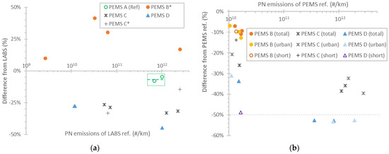 Measurements of PN with PEMS: (a) Laboratory: differences of PEMS from laboratory equipment LABS (Equation (A1)). The asterisk indicates tests with vehicle V1. (b) On-road: differences of PEMS from reference PEMS A (Equation (A2b)).