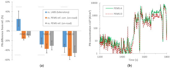 PEMS assessment. (a) The assessment of PEMS in the laboratory and on the road. First blue bars are validation results (Equation (A1)). Second orange bars are the on-road differences corrected with the reference PEMS validation results (Equation (A4b)); third columns are the on-road PEMS differences (Equation (A2)). Error bars give min-max values. Dotted lines give the permissible tolerance defined in the regulation for the validation tests (i.e., PEMS vs. LABS), while the extended tolerances are not plotted. (b) PN real time concentrations.